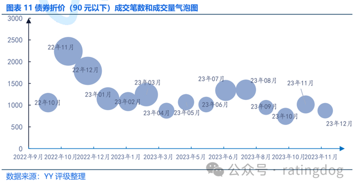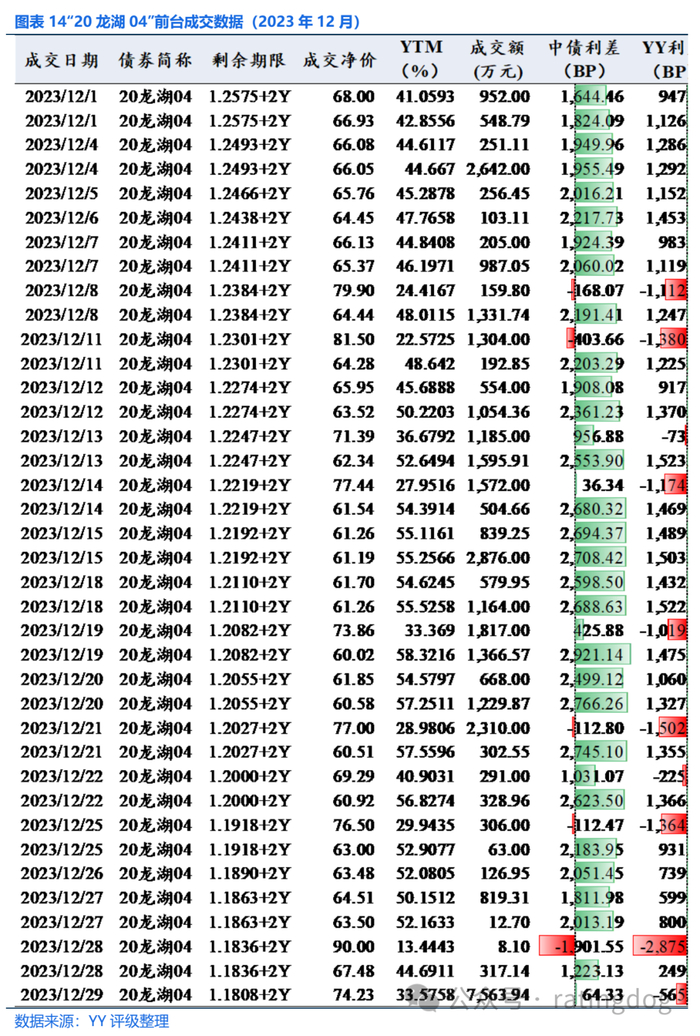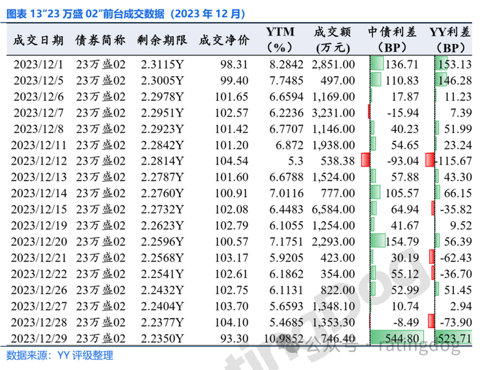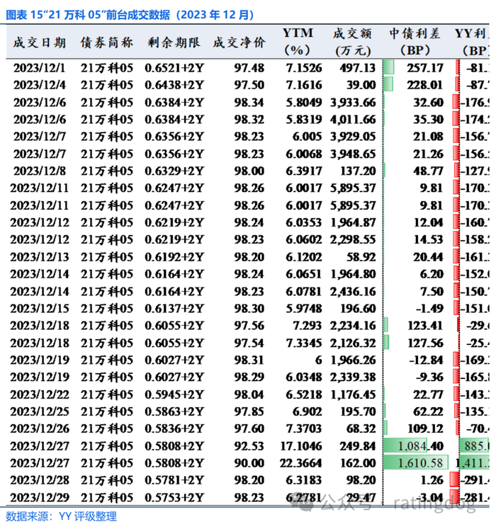 2023年12月万科新增两笔贷款融资,参与银行座谈会,同时,据称至少有两家万科的国有保险公司债权人在与监管沟通后,决定放弃对万科的私募非标债权提前还款的权利,体现深圳国资委和监管机构对万科的支持。本月,代表券“21万科05”(0.6603+2Y)的成交净价维持在98元左右,12月26日成交在97.60元,与月初水平接近。