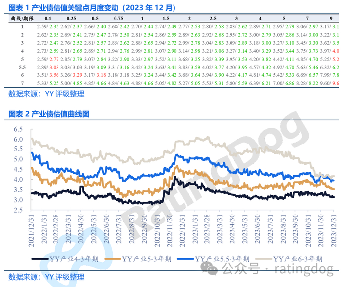 2023年12月,产业债估值曲线整体下行,其中3年期YY产业4、5、6和7分别变化-14BP、-42BP、-5BP和-21BP。