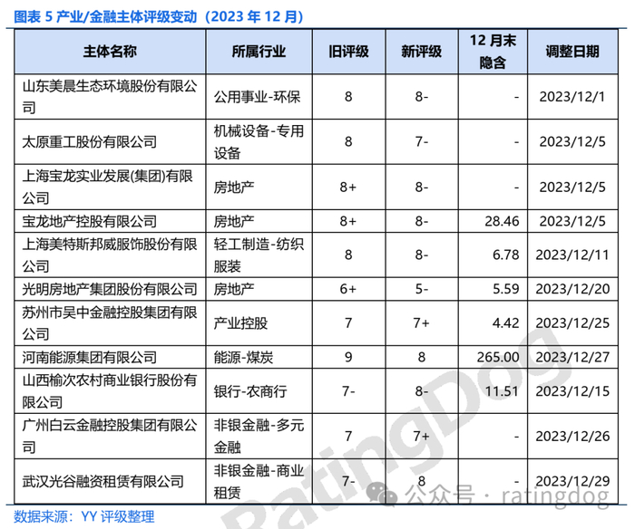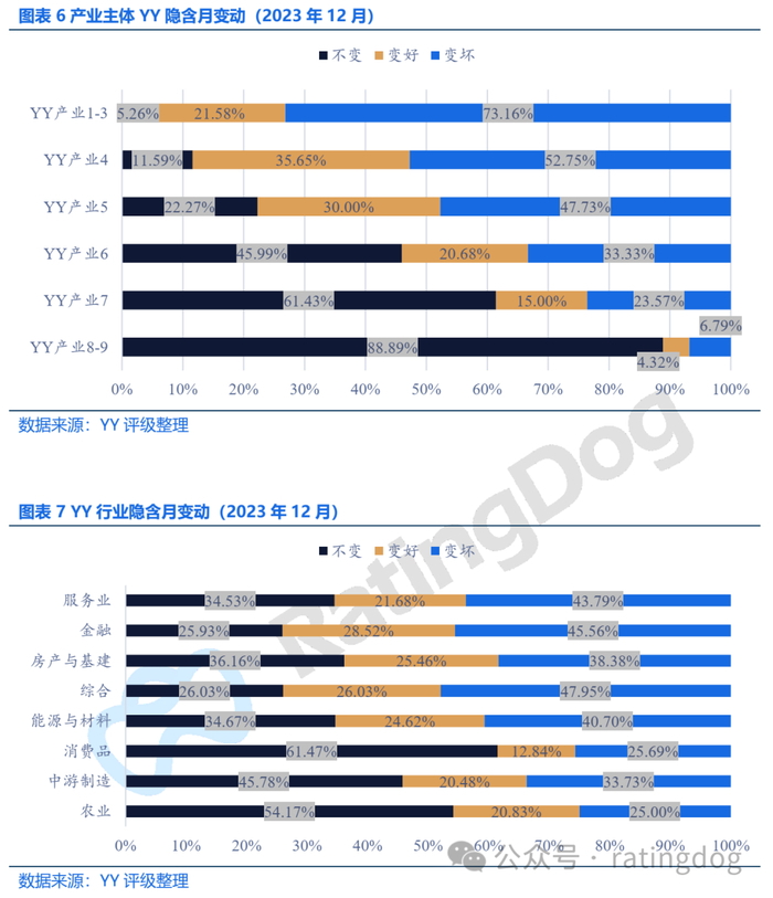 2023年12月产业主体隐含评级变好的数量偏多(变好:变坏=391:683)。