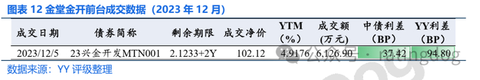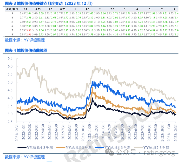 2023年12月,城投债估值曲线亦整体下行,其中3年期YY城投4-7分别变化-13BP、-15BP、-9BP和-17BP。