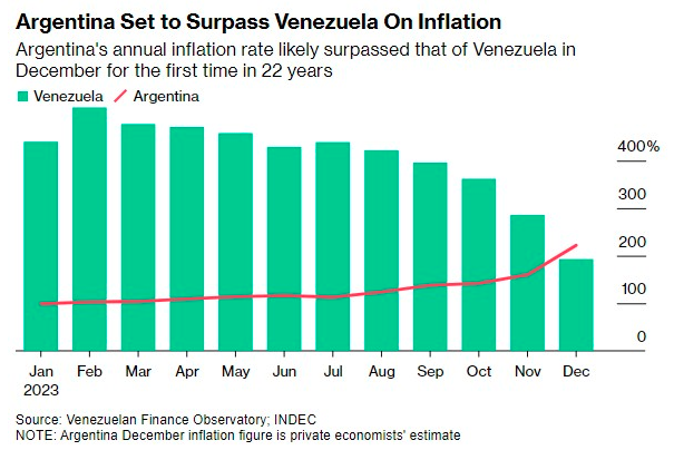 值得一提的是,在拉美地区,委内瑞拉曾长期是经济陷入长期恶性通胀的典型负面教材。不过,阿根廷眼下似乎已“取而代之”。根据业内数据,委内瑞拉上个月的通胀率降至193%。咨询公司Ecoanalitica预计该国通胀将向170%靠近,而阿根廷通胀增速则可能在今年1月继续维持在200%以上的高位。
