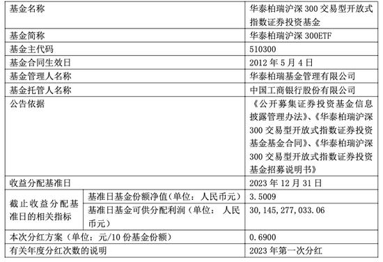 公告显示,华泰柏瑞沪深300ETF的此次分红为2023年第一次分红,收益分配基准日为2023年12月31日,基金份额净值3.5009元,可供分配利润为301.45亿元,分红方案为每10份基金份额0.69元。