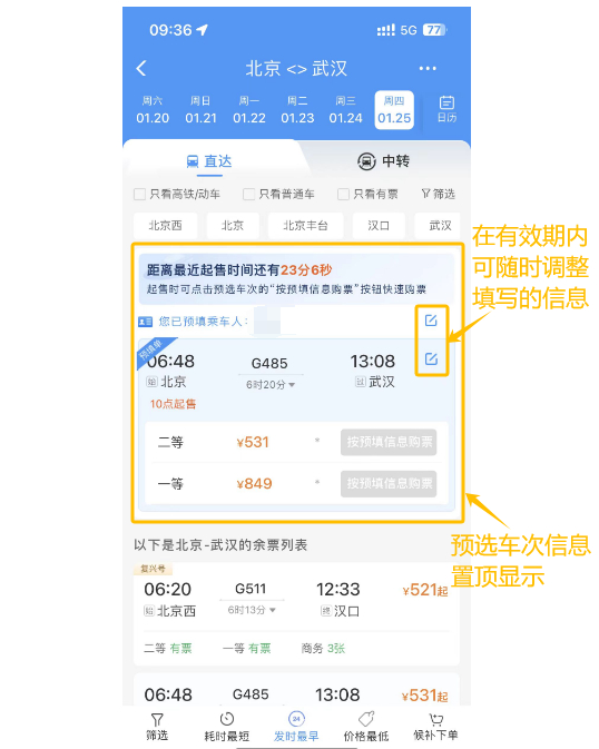 预填成功后,预选的车次会在余票列表页面置顶显示。到起售时间点时,可在余票页面快速提交订单。