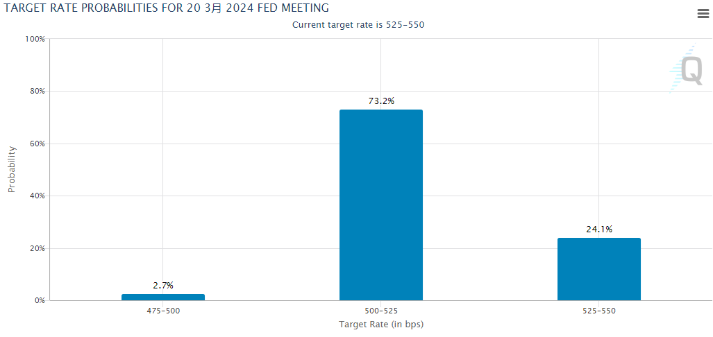 从利率市场的定价看,芝商所的美联储观察工具显示,交易员对美联储在3月降息的概率押注在隔夜最终反而升至了75%,较前一天高出了至少7个百分点。