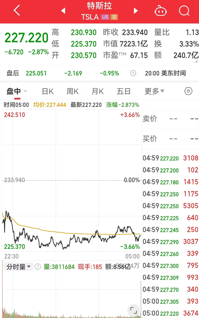 截至当地时间2024年1月11日收盘,特斯拉报227.22美元,跌幅2.87%,市值7223.1亿美元。