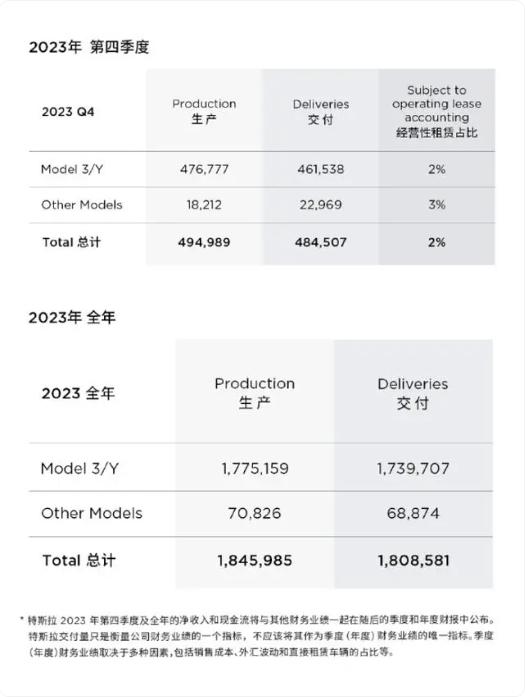 2024年1月2日晚间,特斯拉公布了2023年第四季度汽车产量和交付量。