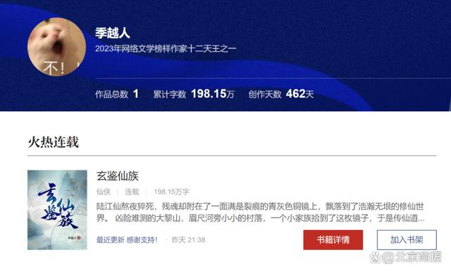 北京商报记者注意到,本次热点事件的主人公《玄鉴仙族》作者季越人,刚刚获得了其所在网文平台的年度“榜样作家十二天王”奖项,本身已站上在平台和网文圈的头部位置。
