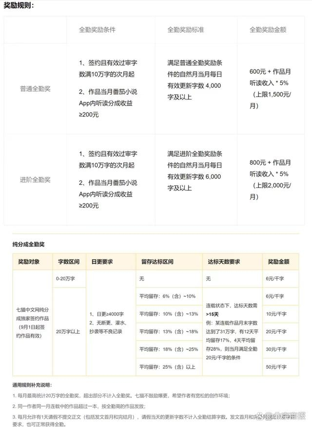 不过,取得奖金还有许多附加要求,在某网文平台,全勤奖领取仅限签约作品,并且需上个月已经完成了10万字以上更新的作者才能从次月起领取奖金。也就意味着,未能与平台达成签约的作者,即使保持日更,还月更10万字以上,仍旧无法通过保持更新频率获得稿费之外的额外收入。