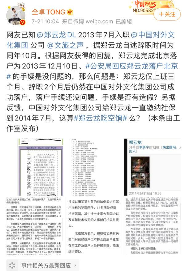 2020年7月21日,因违规高考而受到处理的艺人仝卓,“塌房”后“破罐破摔”,发微博怒撕声入人心男团“好兄弟”郑云龙:“郑云龙仅上班三个月、辞职2个月后仍然在中国对外文化集团(有限)公司成功落户,落户手续还没问题,手续是否有造假?”质疑郑云龙走后门进事业单位。