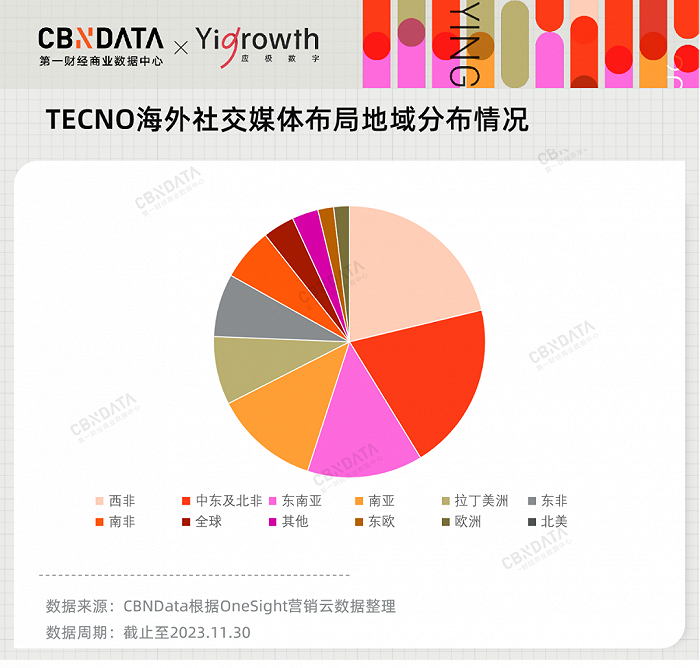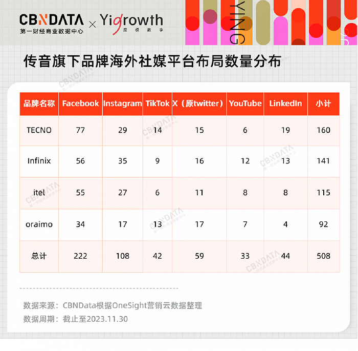 总榜中,TECNO及传音集团旗下年轻潮流科技品牌Infinix、智能生活品牌itel、数码配件品牌Oraimo纷纷上榜。根据OneSight营销云后台数据显示,四大品牌在Facebook、Instagram、TikTok、X (原twitter)、YouTube、Linkedln 六大海外社交媒体公开主页账号总数达508个,粉丝量累计近20亿,其中Facebook、Instagram是其主要布局平台。