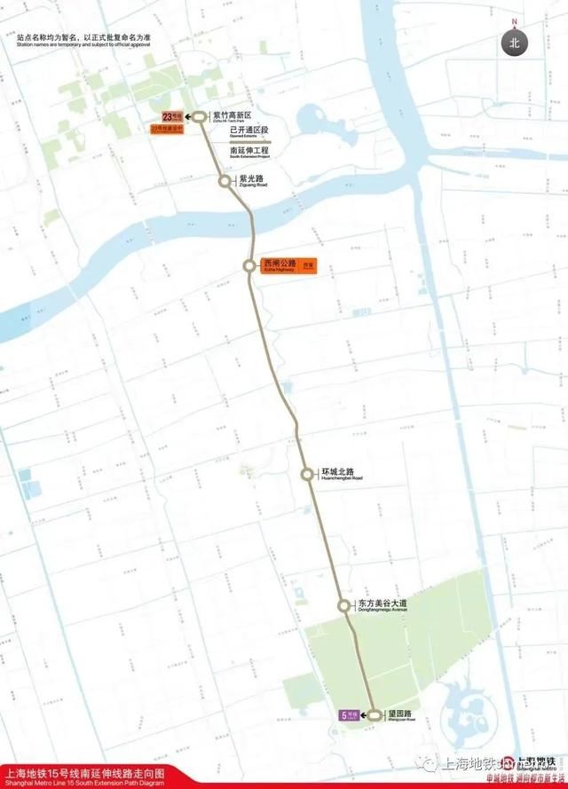 15号线南延伸计划2028年底建成。线路起于紫竹高新区站,终于5号线南延伸望园路站,沿莲花南路—望园路—航南公路走行,闵行新增1个站点(紫光路站)。