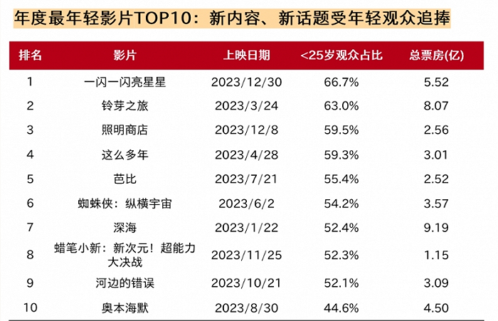 成长的文化环境不同,决定了年轻一代的认知体系和从前有着巨大差异。在猫眼《2023中国电影市场数据洞察报告》中可以看到,25岁以下观众占比最高的影片里,只有像《芭比》《蜘蛛侠:纵横宇宙》《奥本海默》这种更创新的影片占比较高。