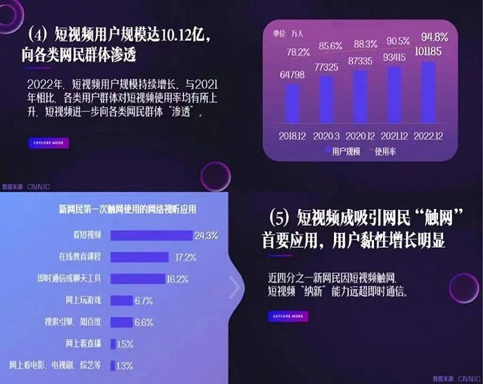 据《中国网络视听发展研究报告(2023)》短视频用户规模已经达到10.12亿,且有近四分之一的新网民因短视频触网,“纳新”能力远超即时通信。足见短视频对触达下沉市场的重要性。