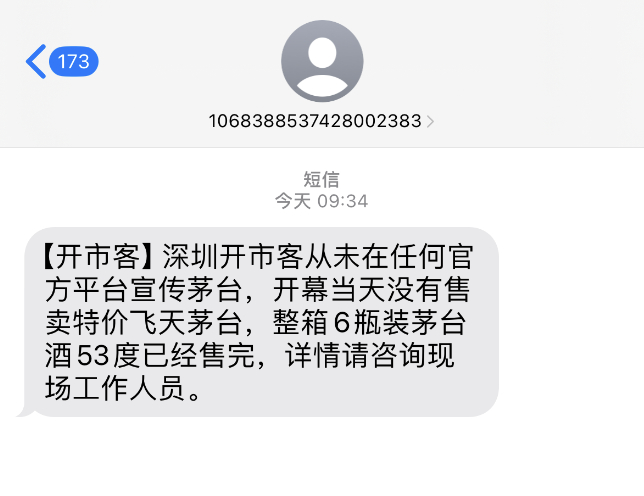 开始营业没多久,就有网友晒出了装有整箱茅台的购物车图片。上午9时30分左右,记者收到Costco发来的提示短信称,“深圳开市客从未在任何官方平台宣传茅台,开幕当天没有售卖特价飞天茅台,整箱6瓶装茅台酒53度已经售完,详情咨询现场工作人员。”随后,记者在现场采访工作人员了解到,当天销售的是2022年份的茅台酒,至于是否飞天茅台,工作人员表示不太清楚,这批茅台以整箱售卖,不作单瓶销售,价格为20499一箱,一箱共有6瓶。