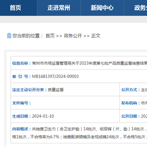 2023年10月起,常州市市场监督管理局根据《2023年常州市重点监督产品目录》,依据《中华人民共和国产品质量法》《中华人民共和国政府信息公开条例》和《产品质量监督抽查管理暂行办法》等规定,分别委托常州市建筑科学研究院集团股份有限公司、亿科检测认证有限公司、常州检验检测标准认证研究院,对常州市生产企业生产、实体店和电商销售的卫生巾(含卫生护垫)、纸尿裤(片、垫)、安全帽、车用尿素、配装眼镜及老视成镜、LED照明产品(专项整治)进行产品质量监督抽查。