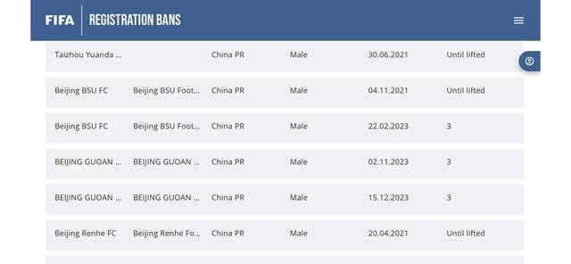 1月11日,国际足联在官方网站上正式推出了数字查阅工具,披露关于俱乐部的注册禁令,这是国际足联近年来推进的纪律工作透明化举措之一,现在任何人都可以通过互联网查看全球正在被实施“注册转会禁令”的俱乐部名单,目前名单中包含多支中国球队。