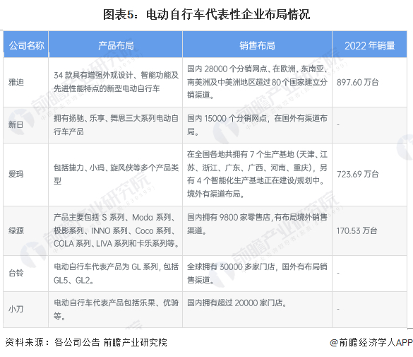 从我国电动自行车代表性企业的布局情况来看,电动自行车销售网点最多的企业为台铃,其次为雅迪。已知销量的品牌中,雅迪电动自行车销量最多,2022年电动自行车销量为897.60万台。