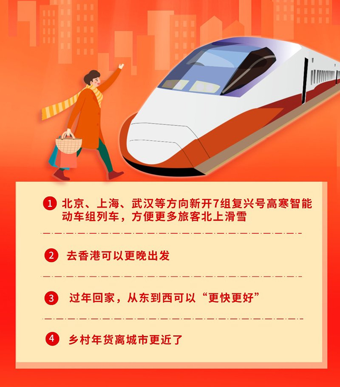 北京、上海、武汉等方向新开7组复兴号高寒智能动车组列车,方便更多旅客北上滑雪。