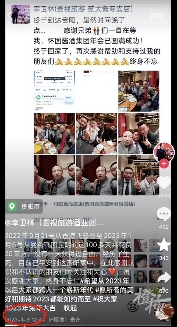 2023年1月9日,幸卫林在抖音发布视频称自己“这100多天里花费20来万,没有一天获得自由,经历了生死,目前平安到达贵阳家中”,该视频下,有网友立刻提出质疑。