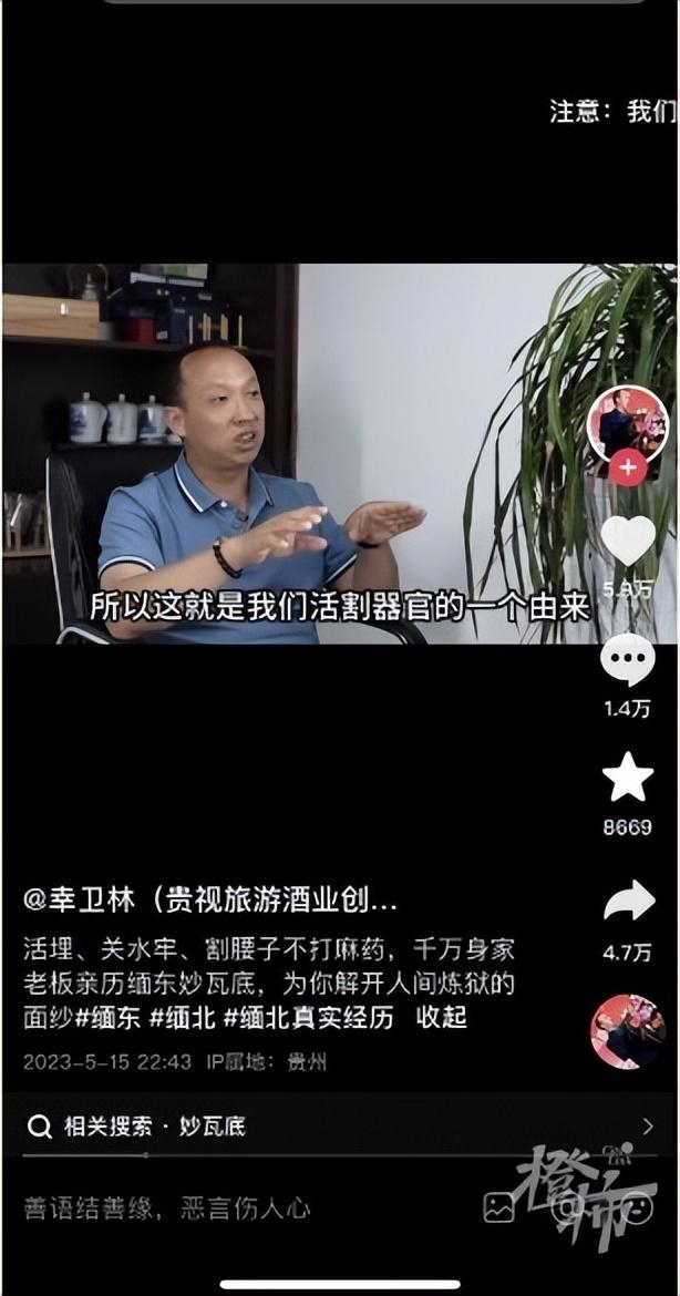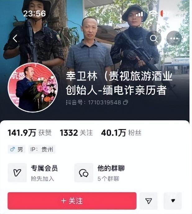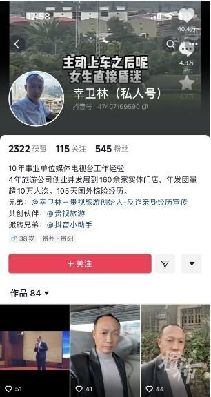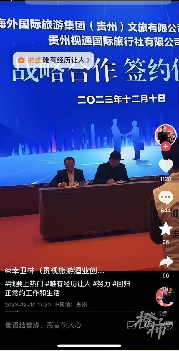 社交媒体上,幸卫林相关的抖音账号有三个,其中粉丝数为40万的“幸卫林”账号(认证信息为:贵视旅游酒业创始人-缅电诈亲历者),最近一次更新是在12月10日,视频内容显示幸卫林在某个签约仪式上。截至今天,已有一个月没更新。