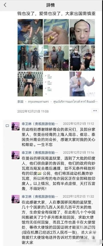 12月21日、23日、28日,幸卫林开始在朋友圈公开自己的遭遇。12月21日的朋友圈中,幸卫林用9张照片和1000多字,向国内的亲友、合作伙伴全面解释了自己在缅甸和泰国的遭遇。
