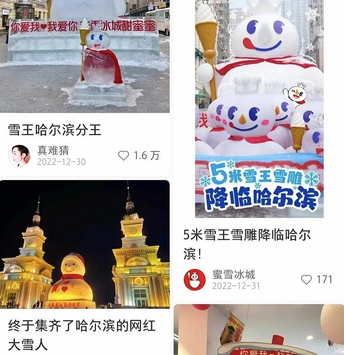 2023 年年初,蜜雪冰城就在哈尔滨中央大街堆了个“雪王”,成功吸引来往路人的注意,虽然从艺术性的视角来看潦草了点,但一点都不妨碍“雪王”IP 像兰蔻「花龙」冰雕那样,成为小红书网友的讨论焦点。