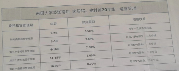 南国大家装江南店项目在销售期间,向业主承诺20年统一运营管理,4个管理期的年均保底收益在购房款的6.5%~8%之间。
