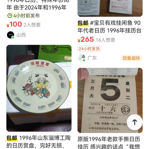 闲鱼方面表示,从今年元旦开始,1996年的旧日历每日的交易量和新发量有走高的趋势,1月9日的成交量达到峰值,最多时有超过400人同时在闲鱼搜索“1996年日历”的关键词。据了解,目前闲鱼平台上1996年的年历及年历制品的均价在94元左右,不少商品的价值飙升超过30倍。