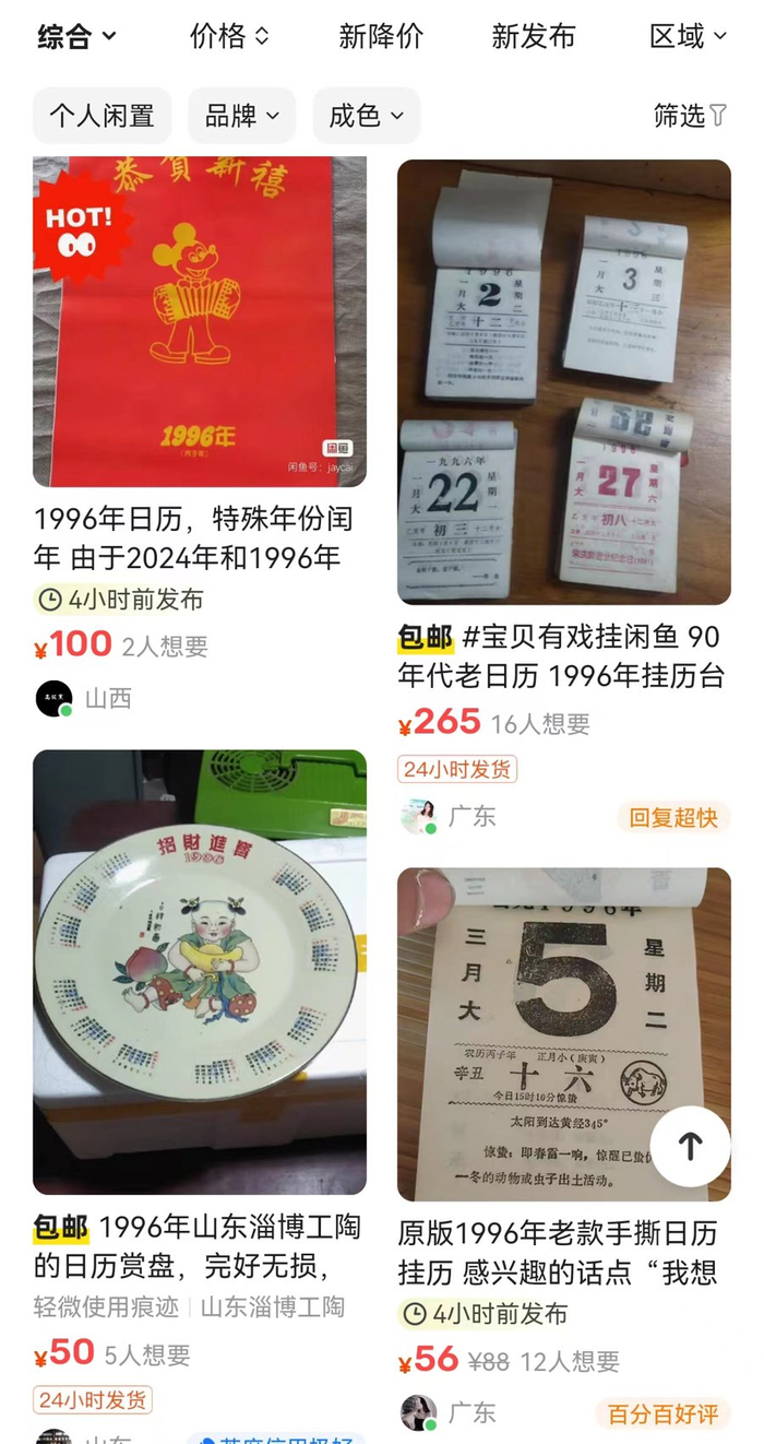 由于2024年和1996年都是闰年,且元旦同为星期一,这意味着今年的日历跟1996年完全一样。因此,不少年轻人“买旧历过新年”,过一把“穿越瘾”。二手交易平台显示,近一周以来,1996年旧日历的搜索量飙升600%,交易量也创历史新高。
