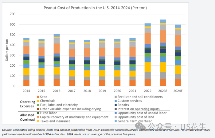 根据美国农业部的花生商品成本和回报,与其他大宗商品一样,在2022年花生的生产成本大幅上涨,之后一直保持在这个新的生产成本水平。图1显示了2024年预测的花生的种植成本为336美元/吨,其中包括种子、化学品、燃料、机械维修和贷款利息等开销。同时,农场的管理费用包括花生经营的农场费用,如劳动力、机械成本和土地的机会成本。叠加农场的管理费用,预计2024年的总生产成本为598美元/吨,比2014年增长28%。这些成本略低于2023年648美元/吨的预测总成本峰值,但已经比十年前上涨了许多。