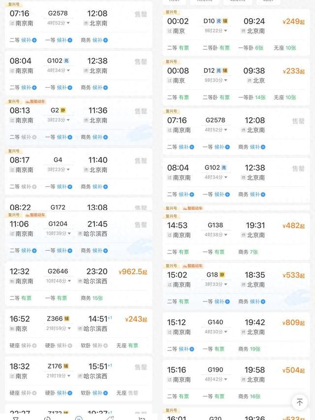 2024年春运首日(1月26日)火车票今起开售。1月12日上午8:00,南京站和南京南站车票正式开售。虽然春运首日距离春节假期还有一段时间,但不少热门车次依旧非常抢手,许多都已显示候补和售罄。上午8:35,记者查询12306看到,南京前往北京、上海、苏州,以及近日热门地哈尔滨等地的车票,大部分都已进入候补状态,距离开售大约半小时的时间,南京至北京只剩下两趟列车有余票。不过截至晚上7:30,记者再次打开12306,发现早晨已售罄的车次有新增不少余票,总体来看,春运首日的车票购买难度不算大。因此,第一时间未抢到票的旅客,可以在不同时段多次打开12306,查看票情变化。