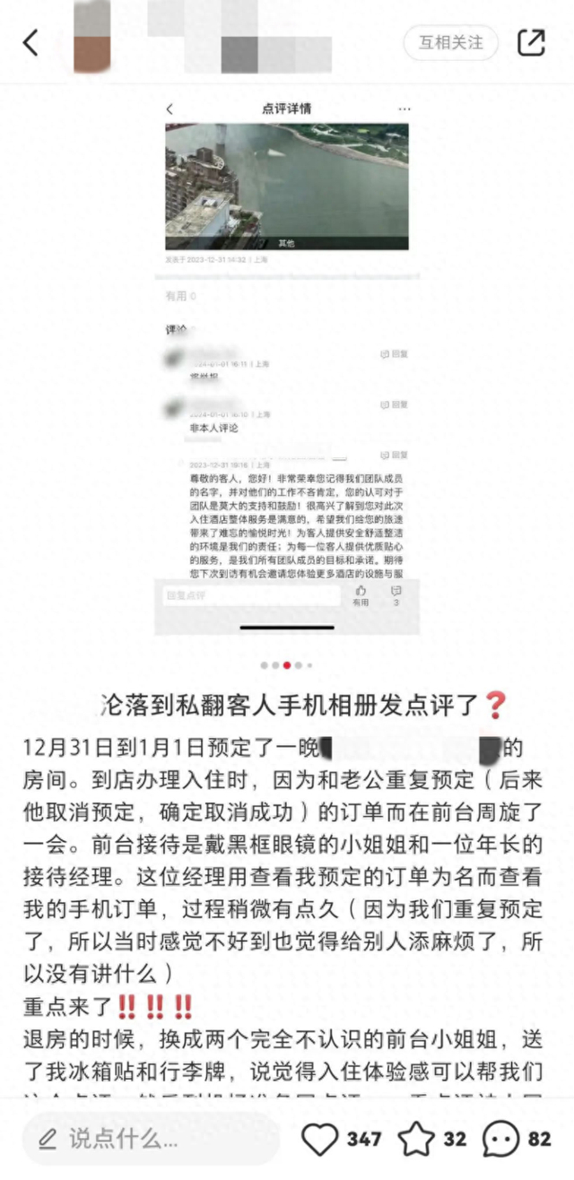近日,有网友在社交平台上发帖表示,在上海某酒店办理入住时,经理以查看订单为由拿走了她手机,然后擅自在平台上发布了好评。该网友表示不可接受,多次找酒店对质,但至今未能达成一致。酒店方则回复称,用客人手机点评一事是在征得客人同意后才进行操作,目前已优化服务流程。
