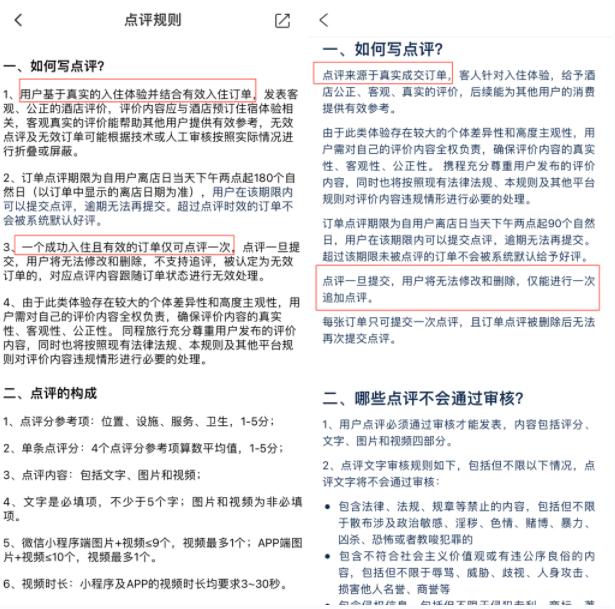 例如,携程就在去年8月实施了新的点评规则。通过“客人实际入住才可以写点评”、“每张订单只可提交一次点评”等规定,提升了刷单的难度与成本,也提升了真实点评的门槛。此外,点评内容也需遵循严格的审核规则,以减少“刷好评”的可能性。