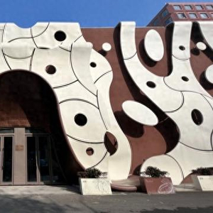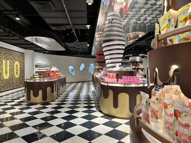 看一眼酷似牛奶巧克力的建筑外观,还没进门,人们可能就会不自觉流起口水。黑白格地砖、棕色墙面,摆在中央正在挖“巧克力蛋糕”的金色勺子雕塑,让人一走进来就能感受到独特氛围。