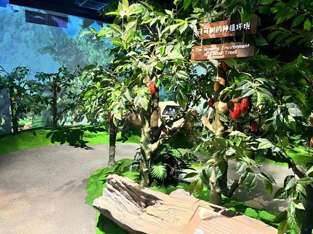 例如,可可树究竟长什么样?一般人可能只见过经过加工处理、成为产品形态的巧克力,但对于可可树、可可果的大小、种植环境并不了解。为了让观众有直观感受,馆内模拟了可可树的生长环境,制作了一比一还原、结满红彤彤可可果的可可树,还通过屏幕讲解了可可花的形态。