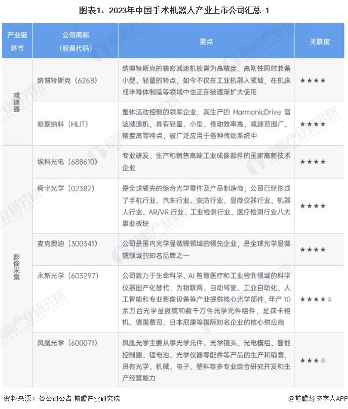 目前,我国应用于手术机器人的伺服电机仍然以海外品牌为主,我国的伺服电机产品在高性能、高可靠性方面与国际品牌存在差距,短期内我国在手术机器人领域的伺服电机仍依赖进口。减速器基本被日本纳博特斯克、哈默纳科占据近80%的市场份额。控制器方面,手术机器人企业通常会对控制器进行自主研发,以保证机器人的稳定性和技术体系。影像采集代表性上市公司主要有埃科光电、舜宇光学、麦克奥迪、永新光学等。手术机器人制造上市公司包括:天智航、威高、微创、堃博医疗、联影医疗、润迈德医疗等。