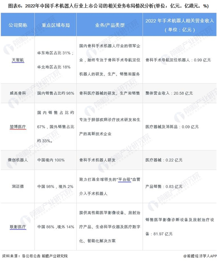 从我国手术机器人行业上市企业的业务布局情况来看,我国手术机器人企业整体尚未具备成熟的盈利能力,境外市场整体尚未打开,目前我国手术机器人上市公司大部分将业务布局聚焦在中国境内。