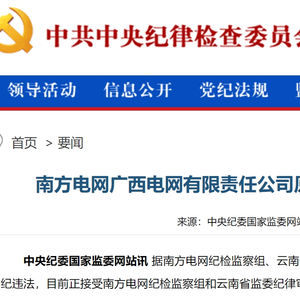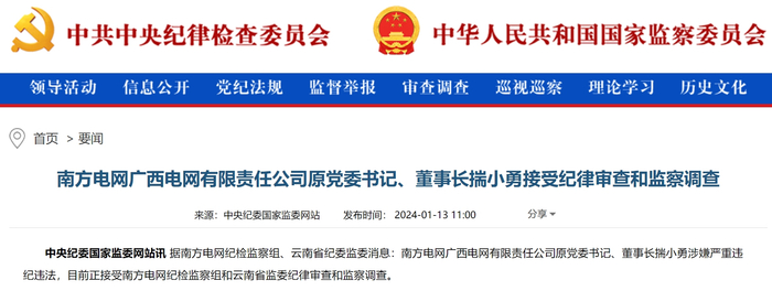 1月13日,中央纪委国家监委网站通报,南方电网广西电网有限责任公司原党委书记、董事长揣小勇接受纪律审查和监察调查。