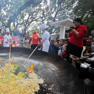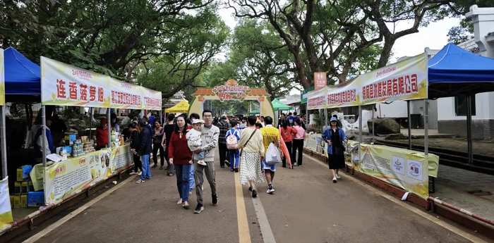 炒饭的新鲜出炉,让不少人吃上了龙年第一锅团圆菠萝宴,感受当地“中国长寿之乡”徐闻的淳朴乡情。菠萝宴旁边还设置购物一条街,菠萝酥、菠萝年糕等徐闻加工衍生产品齐上阵,满足观众口味,让观众了解徐闻菠萝的多样玩法。