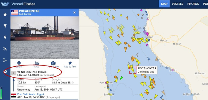 散货船“POCAHONTAS”自1月10日从埃及第二大港口塞得港出发,目前位于红海区域,预计将于14日抵达目的地,其“目的地”一栏仍显示“与以色列没有关系”(NO CONTACT ISRAEL)。