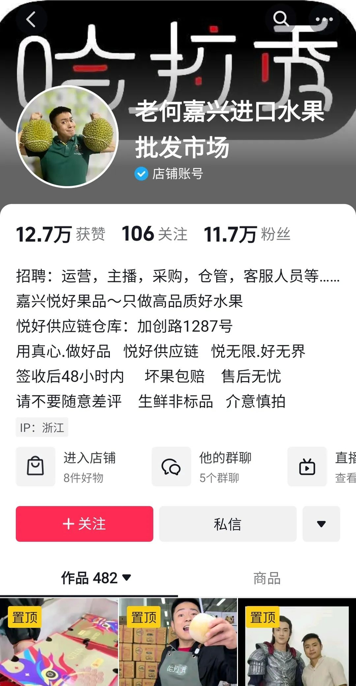 在嘉兴,老何是第一个做水果类直播的商家。在这之前他尝试过一些其它职业,前年抱着试一下的态度加入抖音商城,没想到涨粉迅猛,销售两度爆发,一年内跃升本地头部商家。去年4月26日是一周年店庆,老何直播间来了2万多人,他在一片欢呼中切下蛋糕,他觉得那是自己的高光时刻。