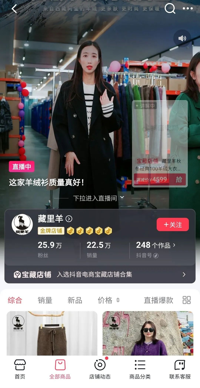 如今藏里羊已经成为高端成衣届的新起之秀,去年在抖音电商自播的场均营业额突破百万,店铺自播累计成交订单量突破8万单。其中爆品不断,是至关重要的一环。创始人李建红、何利娜夫妇也总结出一套抖音商城爆品方法论——