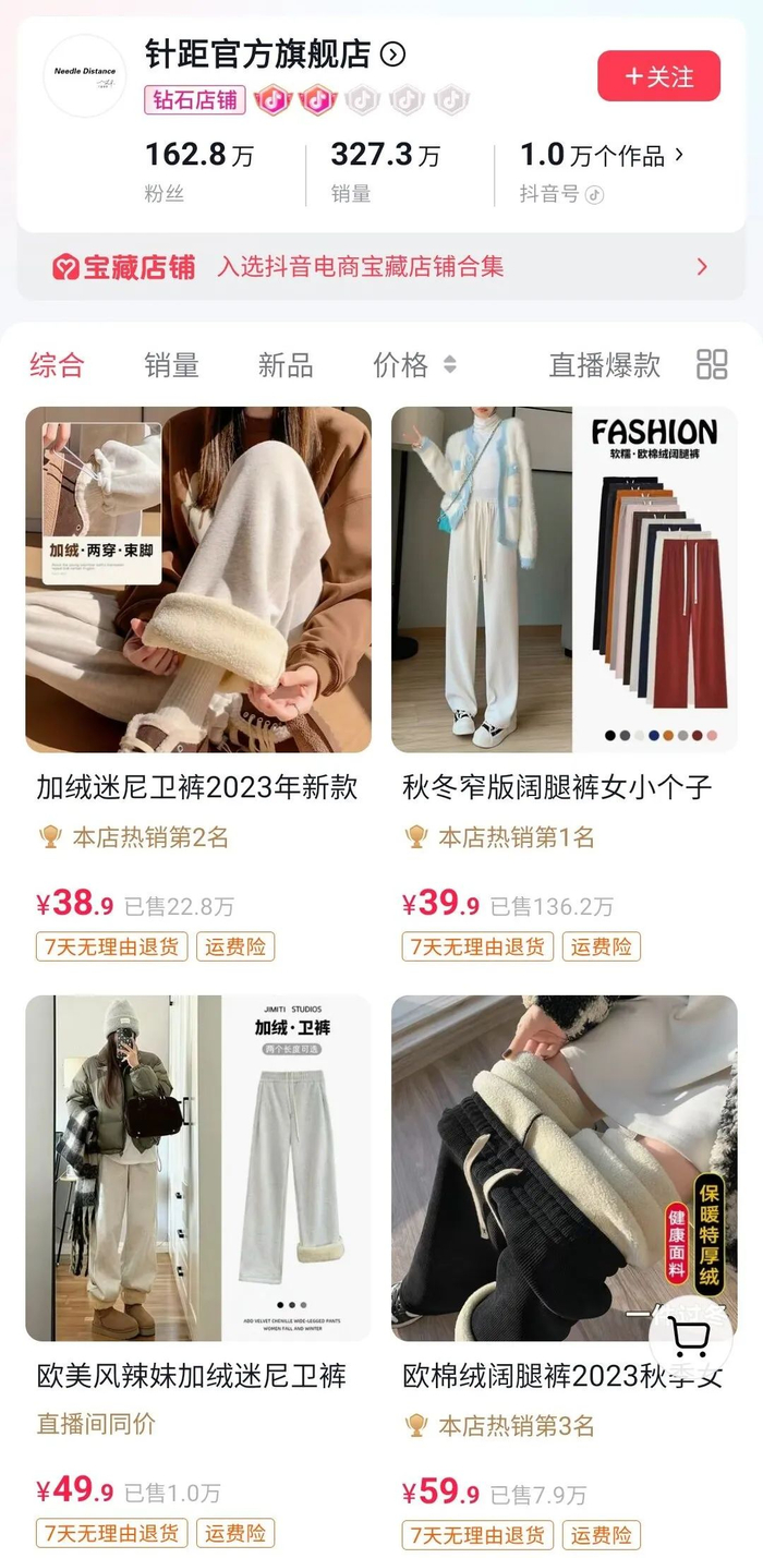 去年针距上市了一款双面奥粒绒的哈伦裤,点赞收藏和转化率都不好,上线一周之内便被吴伟淘汰。另一款行云流水阔腿裤,则是爆发效果惊人,发布第三天便能卖到5000单/天。推出后,不少视频和直播达人联系针距,想要同步推广,公司立刻加大了生产和推广的力度。后续这款裤子销量涨至2万单/天。