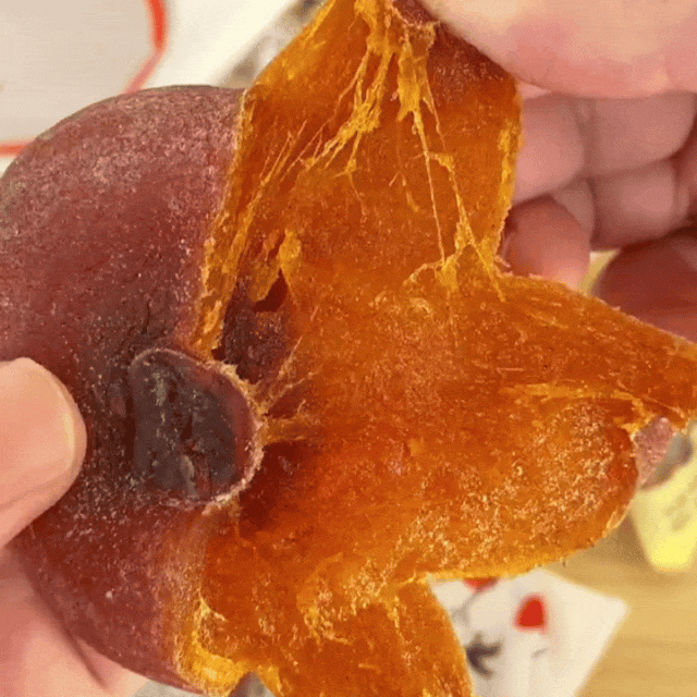 除了表层自然附着的白霜,每个柿饼里面,还窝着一汪通亮的溏心。真的太太太好吃了,小编第一口就被征服!