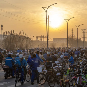 江南造船拥有两万七千多员工,每天早上7点,工人们穿过长兴江南大道进入厂区。本报记者 孟雨涵 摄