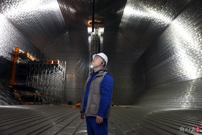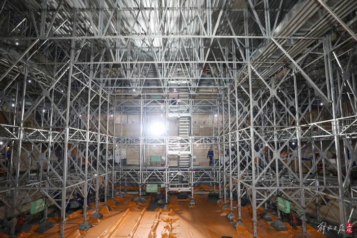 在建ING船内舱,表层特殊材料“殷瓦钢”焊接得严丝合缝,脚手架将撤离。