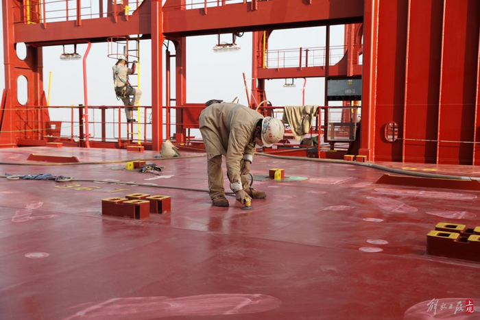 工人们在LNG船内舱进行平面绝缘箱的树脂生产与敷设作业。