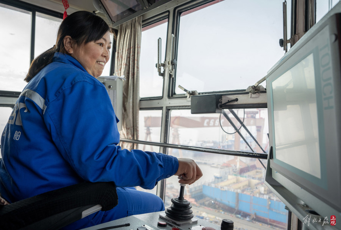 “我的眼睛就是尺子。”江南造船龙门吊司机梁梅专司吊装液化气船的液罐,每到吊装关键时刻,她总会情不自禁地咬住下嘴唇。她是厂内最大龙门吊(1600吨)的司机,在江南造船干了18年。精准吊装是个精细活,操作难度极大,需要司机在上百米的高空,对脚下船坞中的船体和液罐进行毫米级的“对准”操作。“责任很大,万一发生碰撞,可就是一大笔损失呢!”