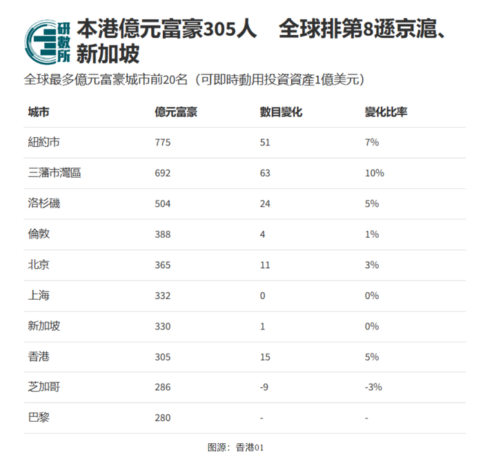 排在第一的是纽约,亚洲上榜的分别有:北京、上海、新加坡、香港。只能感慨一句:香港最不缺的就是富豪。