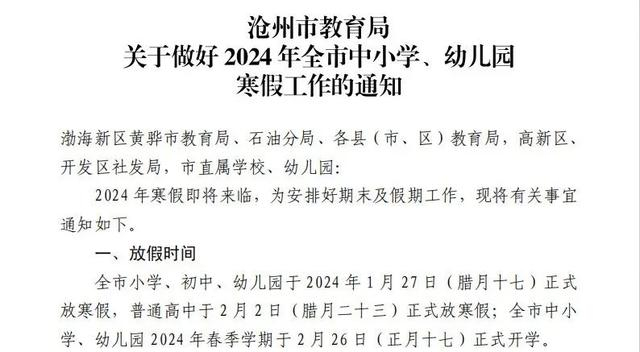 1月8日,沧州市教育局公布2024年中小学、幼儿园寒假放假时间: